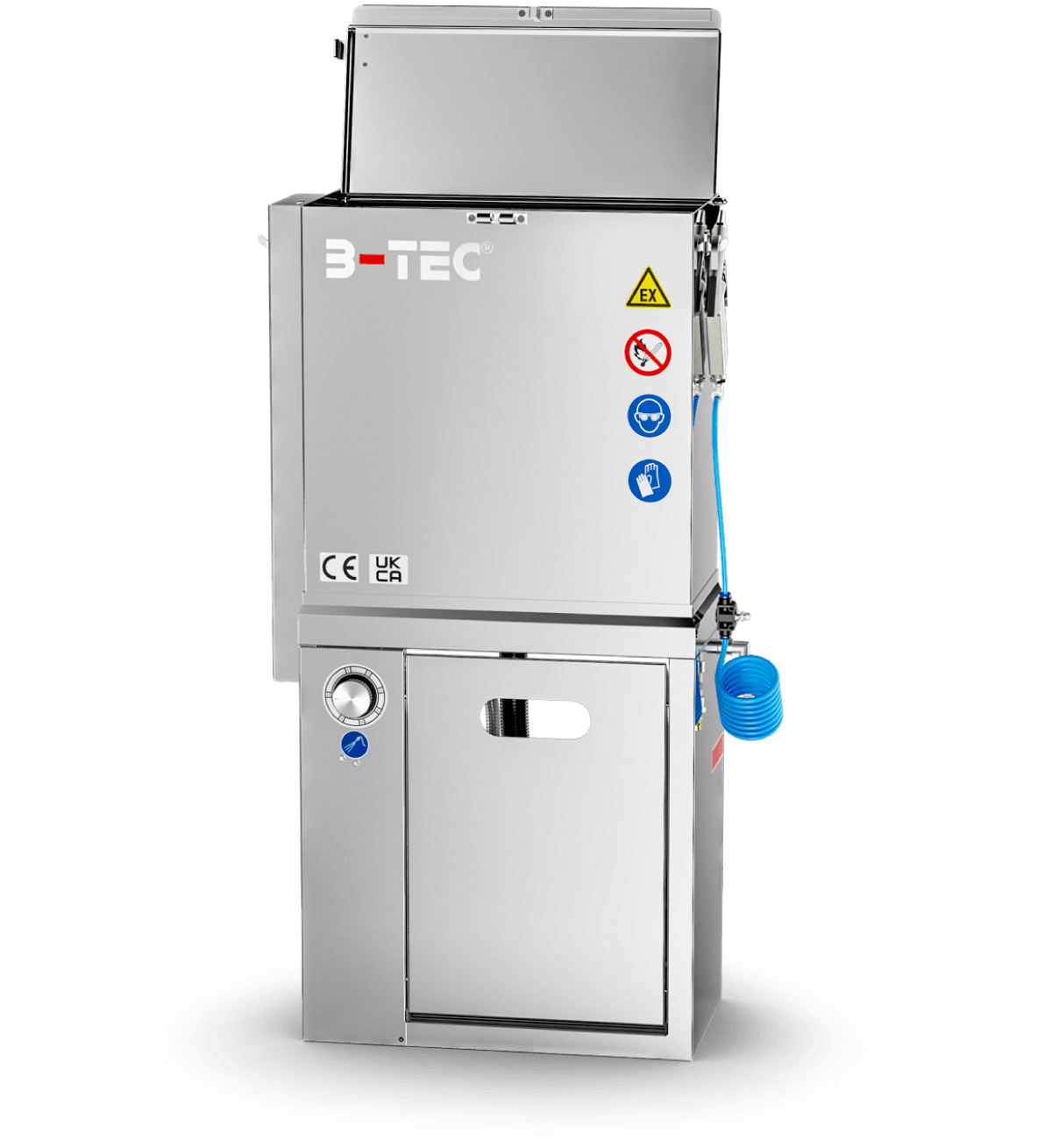 With the innovative SPEEDBOX-MoonWalk cleaning system, all residues, dirt and paint deposits which can accumulate over time on the underside of the MoonWalk dosing unit can be effectively removed. An optimum result is achieved with the water-based paint cleaner B-TEC H2O-Cleaner-MW. By using the SPEEDBOX-MoonWalk, which is suitable for all container sizes, you increase your efficiency, extend the service life of MoonWalk dosing units and make your mixing process even safer.