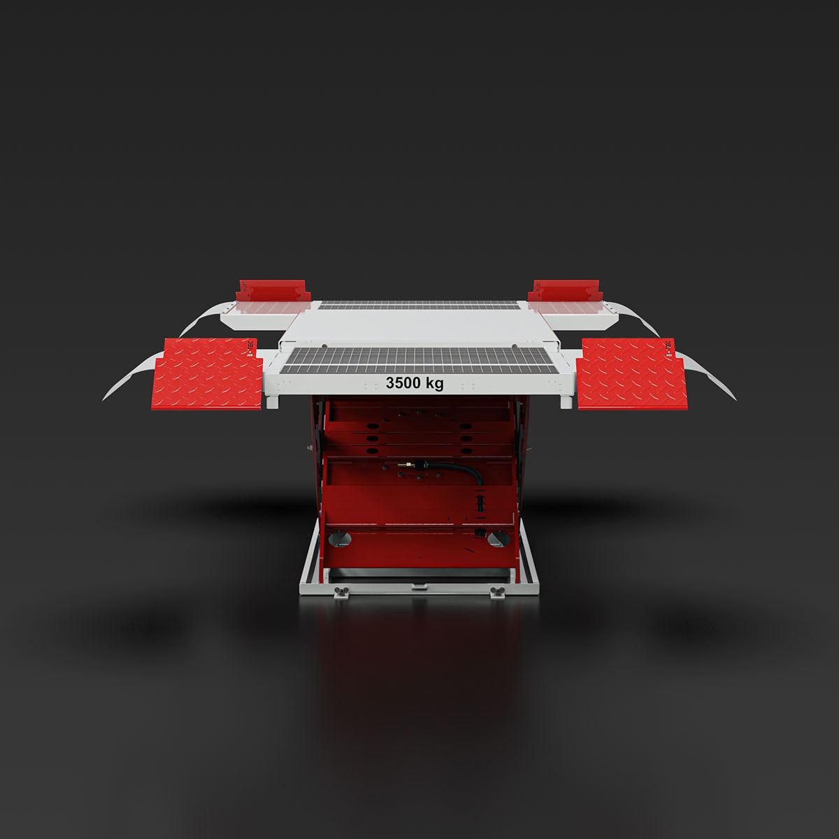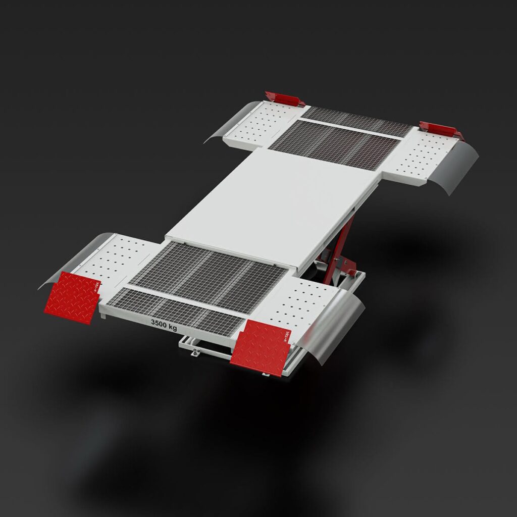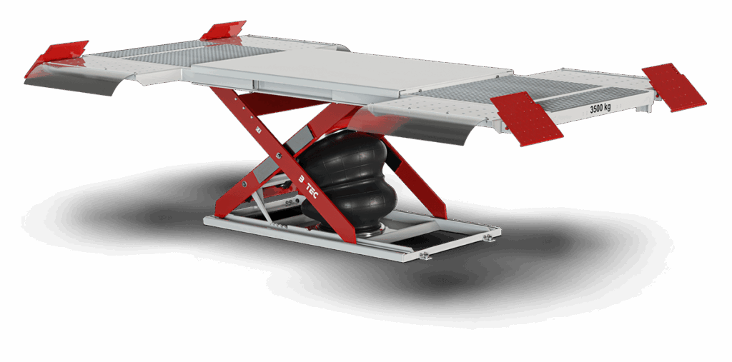 Pneumatische Hebebühne zum Einbau in Gruben des Hebebühnentyps „K900“ – zum Anheben von Fahrzeugen auf Rädern stehend mit 3,5 Tonnen Tragkraft. 100% Made in Germany.