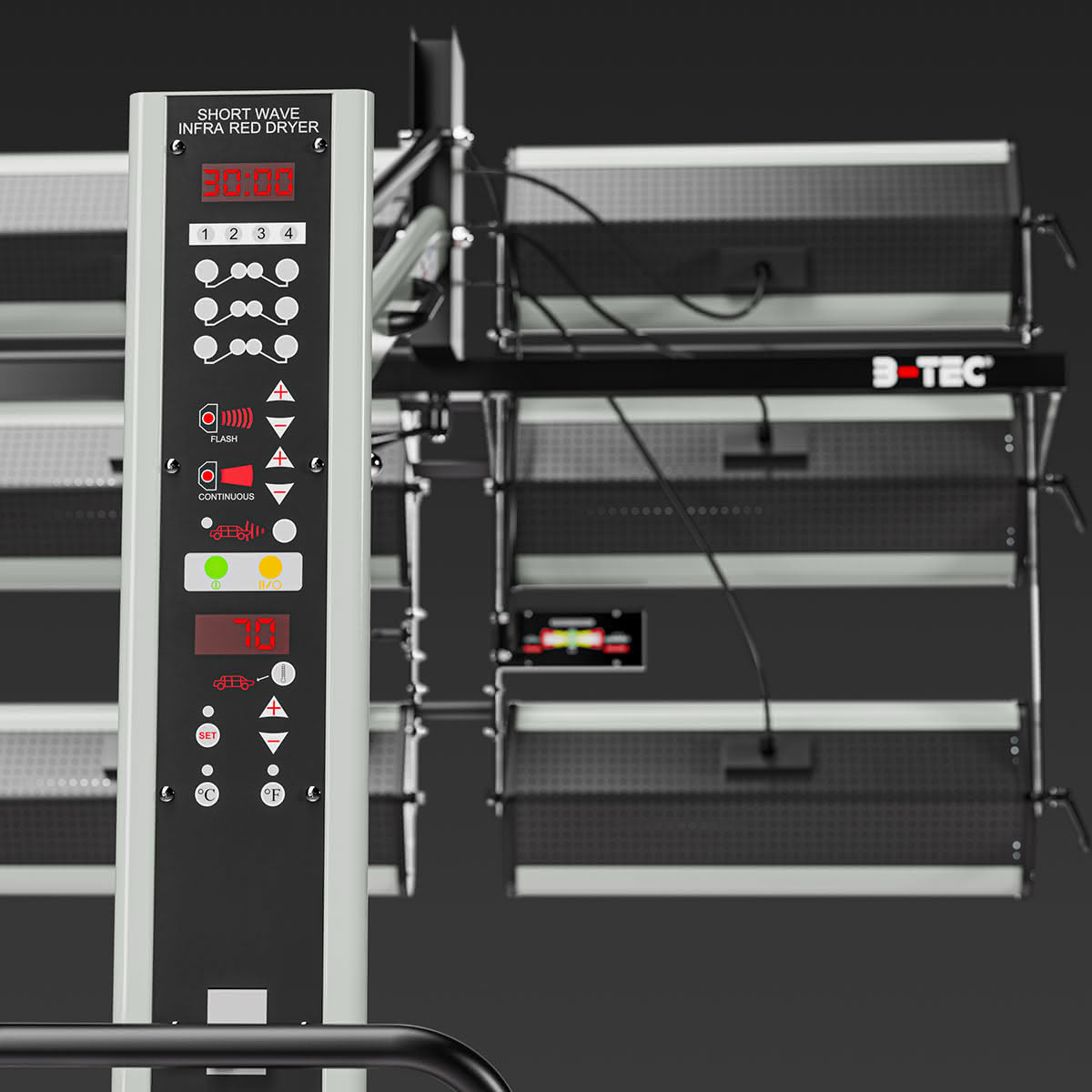Wie alle B-TEC IR-Trocknungsstrahler (exklusive IR-X) verfügt auch der IR-B06 über eine 2-Stufen Trocknung (Flashlight / Dauertrocknung), um den Lack schonend von innen nach außen zu erhitzen und so Lackierprobleme wie „Kocher“ und „Beifallen“ zu verhindern.
