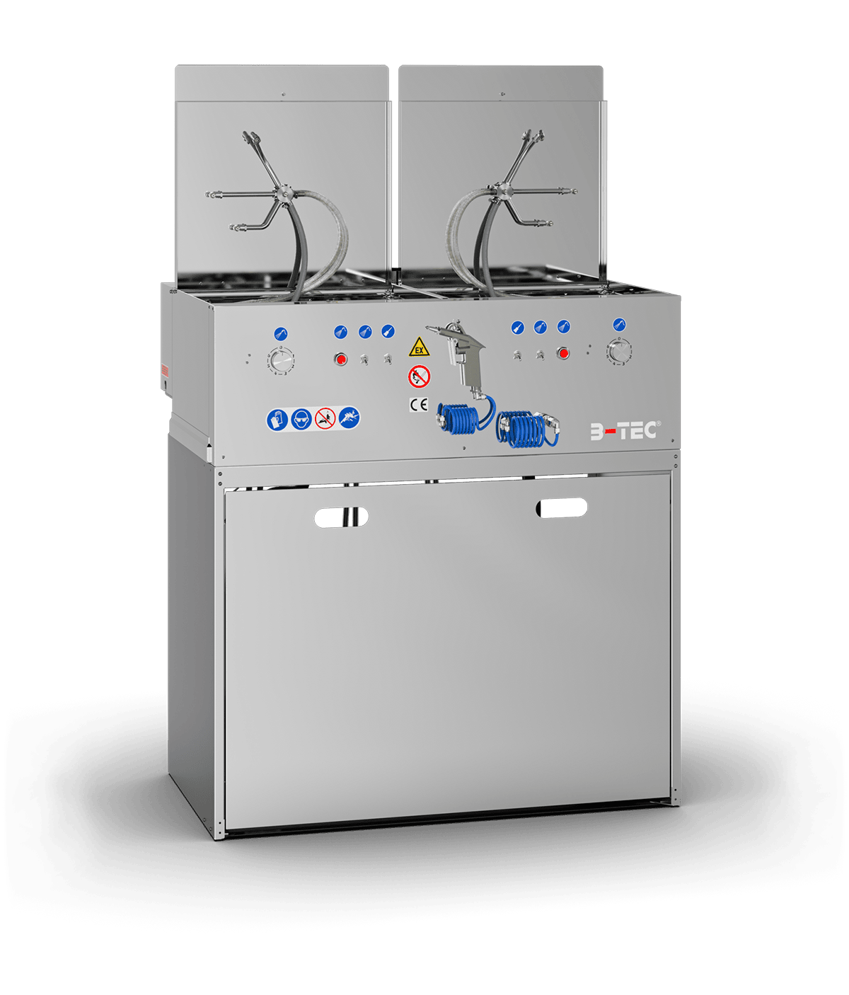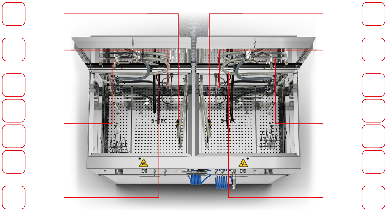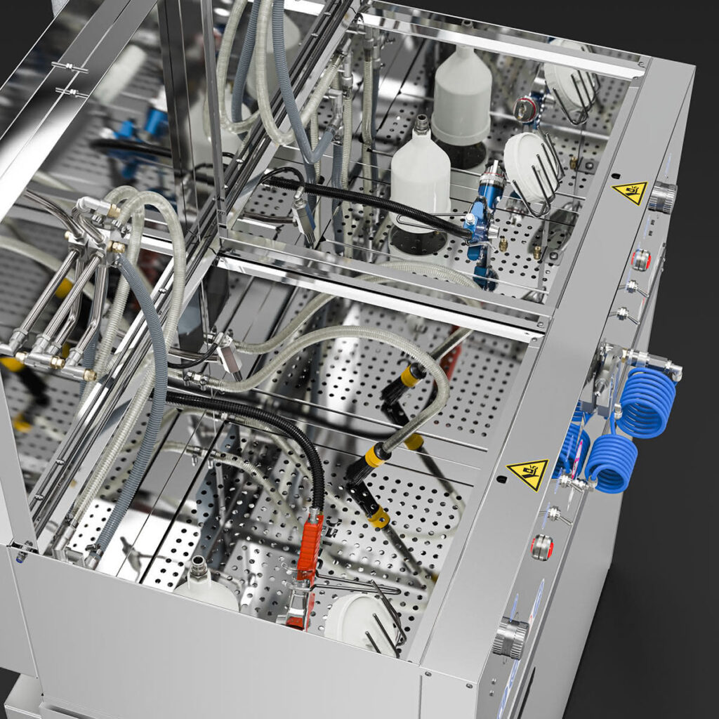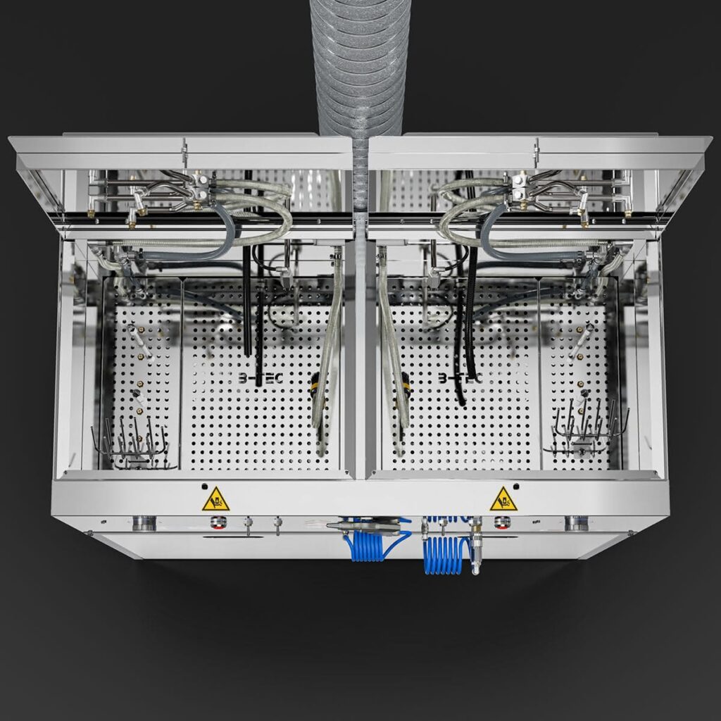 Das Waschgerät besteht aus zwei unabhängigen Waschräumen, die wahlweise mit Lösemittel / B-TEC E2C, wässrigen Reinigern oder jeweils mit einem anderen Reinigungsmedium eingesetzt werden können.