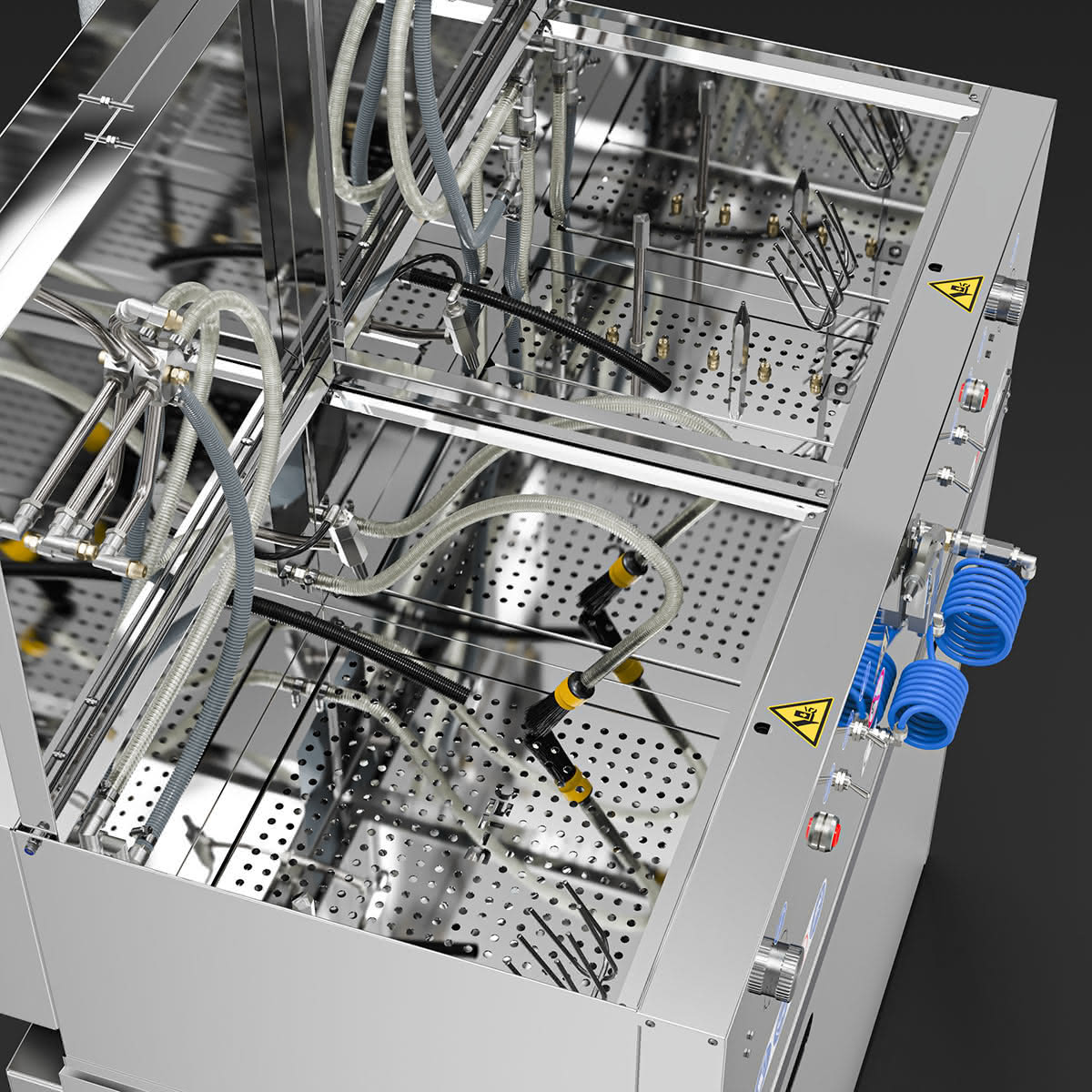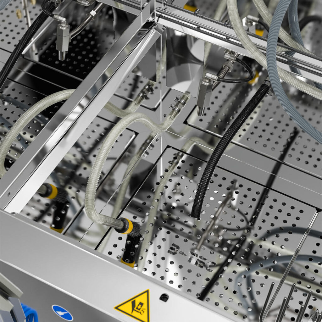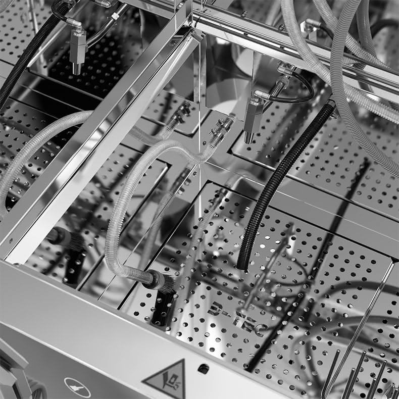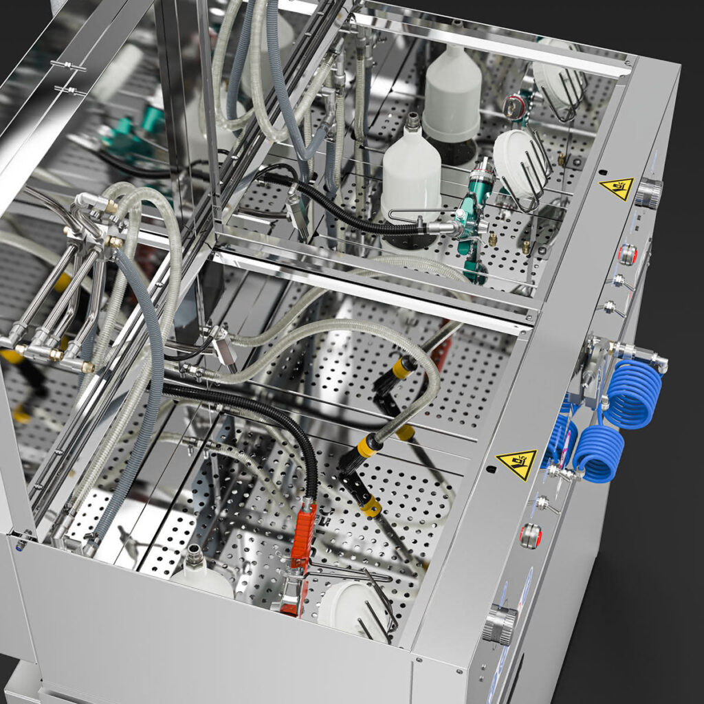 Das Waschgerät besteht aus zwei unabhängigen Waschräumen, die wahlweise mit Lösemittel / B-TEC E2C, wässrigen Reinigern oder jeweils mit einem anderen Reinigungsmedium eingesetzt werden können.