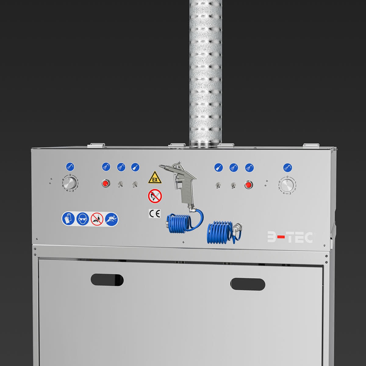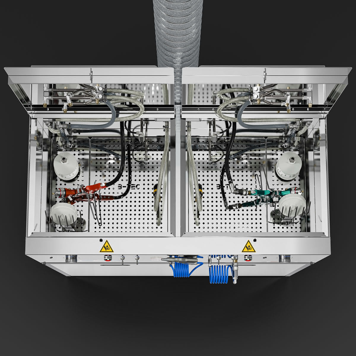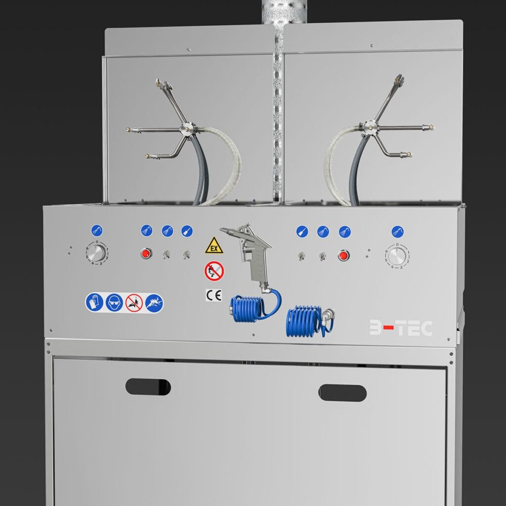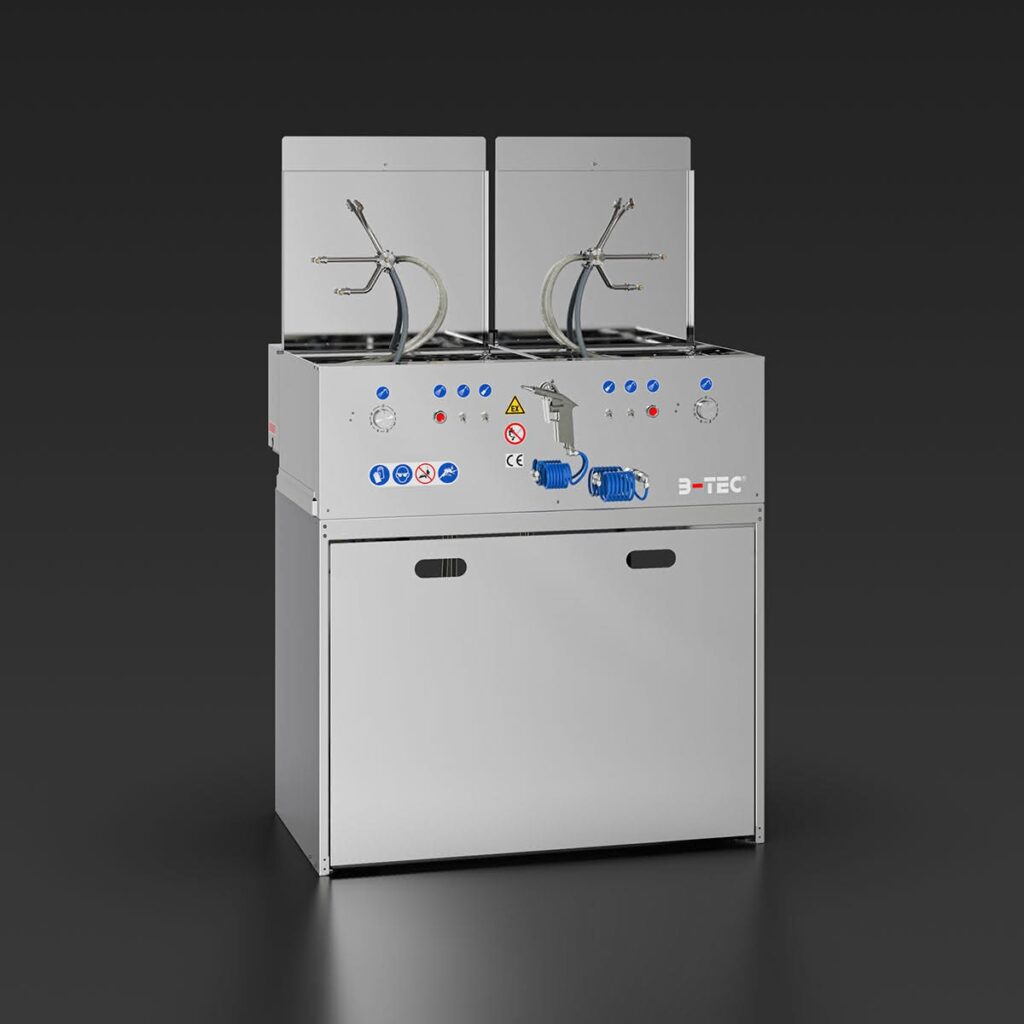 Das Basismodul des S.U.M.O. besteht aus zwei kompakten, unabhängigen Waschräumen, der vertraut starken B-TEC Absaugung für beide Geräteseiten sowie einer universellen Aus- und Abblaspistole.