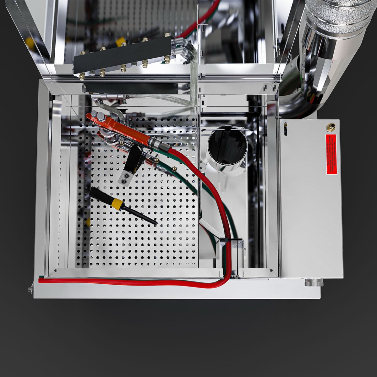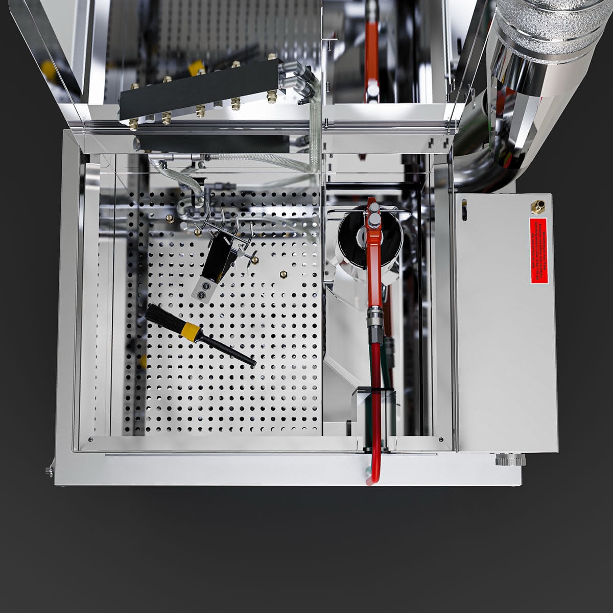 Das Ausblasen und Durchspülen der Materialschläuche wird bei laufender Absaugung im offenen Gerät durchgeführt – ATEX konform und frei von Overspray.